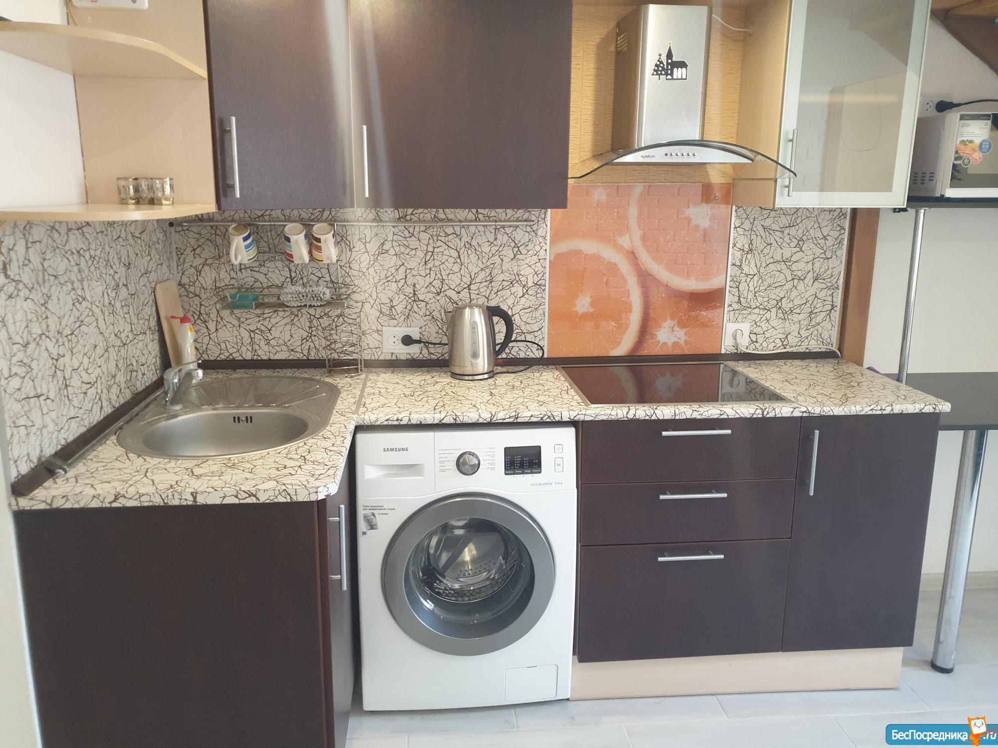 Из техники: мощная сплит-система, плита, духовая печь, вытяжка, холодильник, стиральная машина, микроволновка, утюг, электро-чайник, телевизор. Есть пылесос.