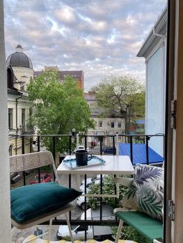 Из техники: сплит, стиралка, посудомойка, микроволновка, плита газовая, духовка электрическая, холодильник. Отопление центральное, горячая вода через колонку. Есть место под ТВ и место, чтобы расположить проектор. Открытый, уютный балкон, со столиком и стульями.