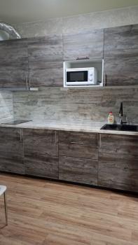 На кухне очень хороший новейший холодильник, посудомойка, вытяжка, плита и даже мультиварка. В том числе осмосный фильтр Гейзер для питьевой воды. Кухня большая, просторная. Стол и 4 стула имеются.