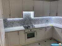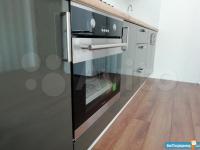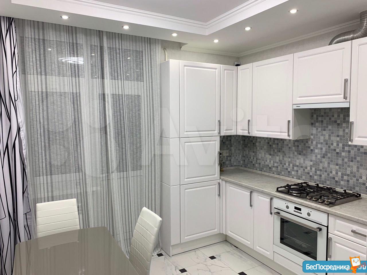 В кухне: Большой кухонный гарнитур со встроенной техникой (вытяжка с сенсорным управлением, газовая варочная панель с контролем газа, электрический духовой шкаф), микроволновка, стол и 4 стула, большой холодильник NoFrost.