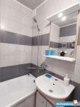Кухня просторная, оснащена современной техникой: холодильник, микроволновая печь, плита. Есть обеденный стол (широкая барная стойка) и барные стулья. Ванная комната и туалет раздельные, выполнены в современном стиле с качественной отделкой.