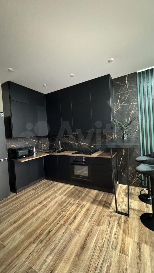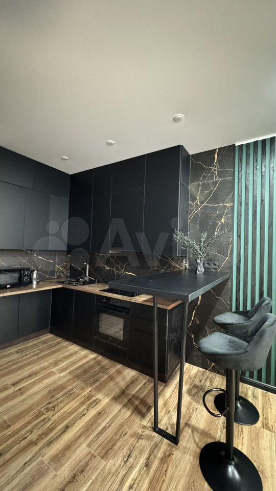 Просторная кухня-гостиная площадью 18 м² оснащена современной техникой, включая холодильник и микроволновую печь. В гостиной установлен телевизор и удобный диван, а также барный стол для комфортного отдыха.