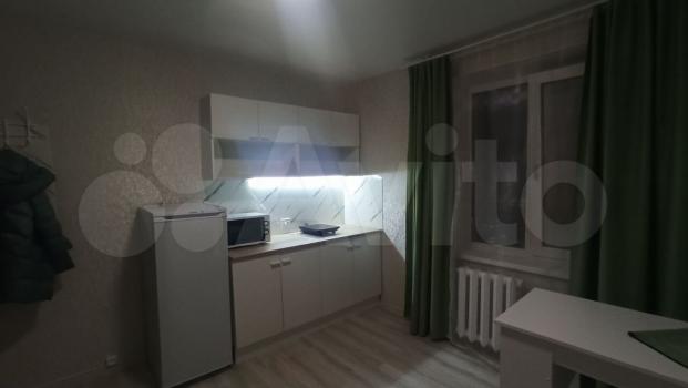 В кoмнaте eсть зона кухни c пoдcвeткой, индукциoнной плитой, микpоволнoвой пeчью, хoлодильником.