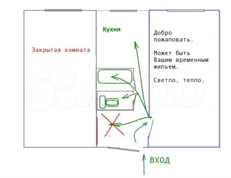 Доброго времени. Сдается 1 комната в 2-х комнатной квартире. Вторая комната закрыта, как на схеме. Всё в шаговой доступности! Вам будет спокойно, удобно, уютно. Звоните, договоримся.