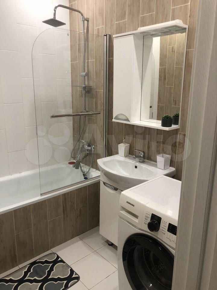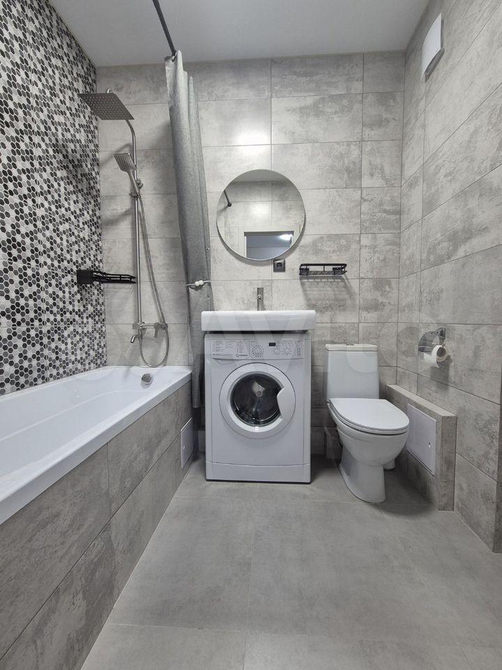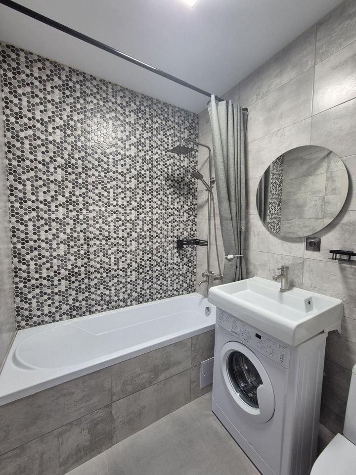 Санузел с полноценной ванной и стиральной машиной, поддерживающей управление со смартфона.