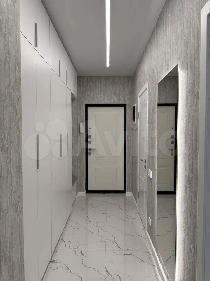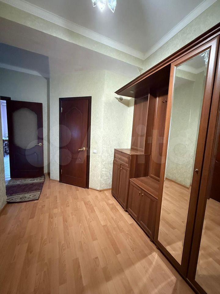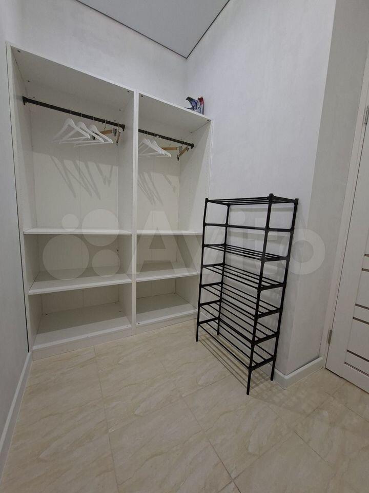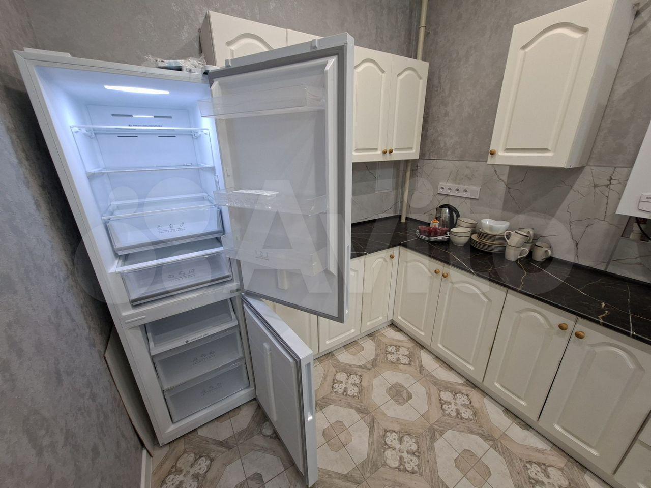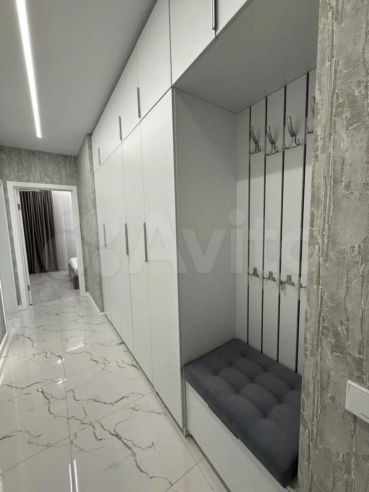 Кухня просторная, площадью 11 квадратных метров, оборудована современной техникой, включая холодильник. В гостиной установлен телевизор и удобный диван, а также имеется гардеробная для хранения вещей.