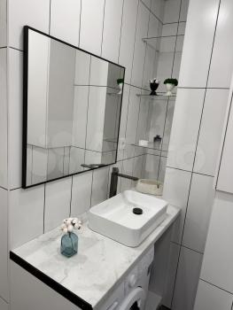 Кухня оснащена всем необходимым: газовой плитой, холодильником и стиральной машиной. Санузел совмещенный, оформлен в светлых тонах и оснащен современной сантехникой.