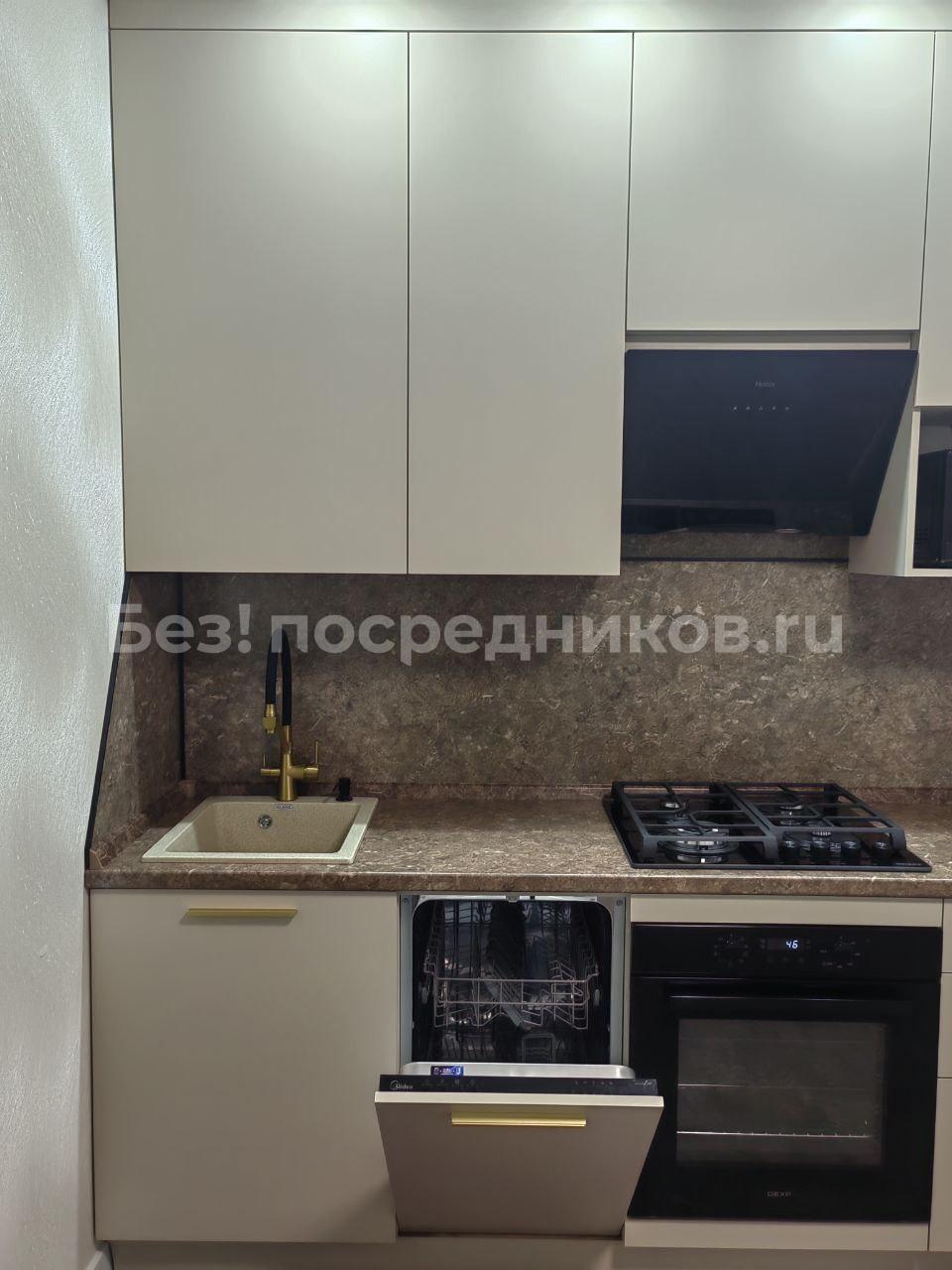 Из техники есть сплит-система, телевизор, варочная панель, духовой шкаф, микроволновка, холодильник, стиральная машина.