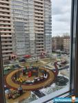Из окна видно детскую площадку.
