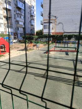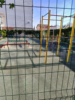 - Огороженная детская площадка с турниками и тренажёрами для молодёжи.
