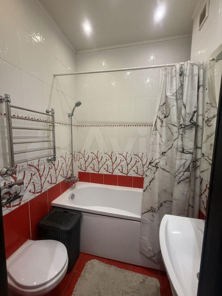 Санузел совмещенный, оформлен в ярких тонах, оснащен ванной и стиральной машиной. В подъезде есть пассажирский и грузовой лифты, а также подземная парковка.
